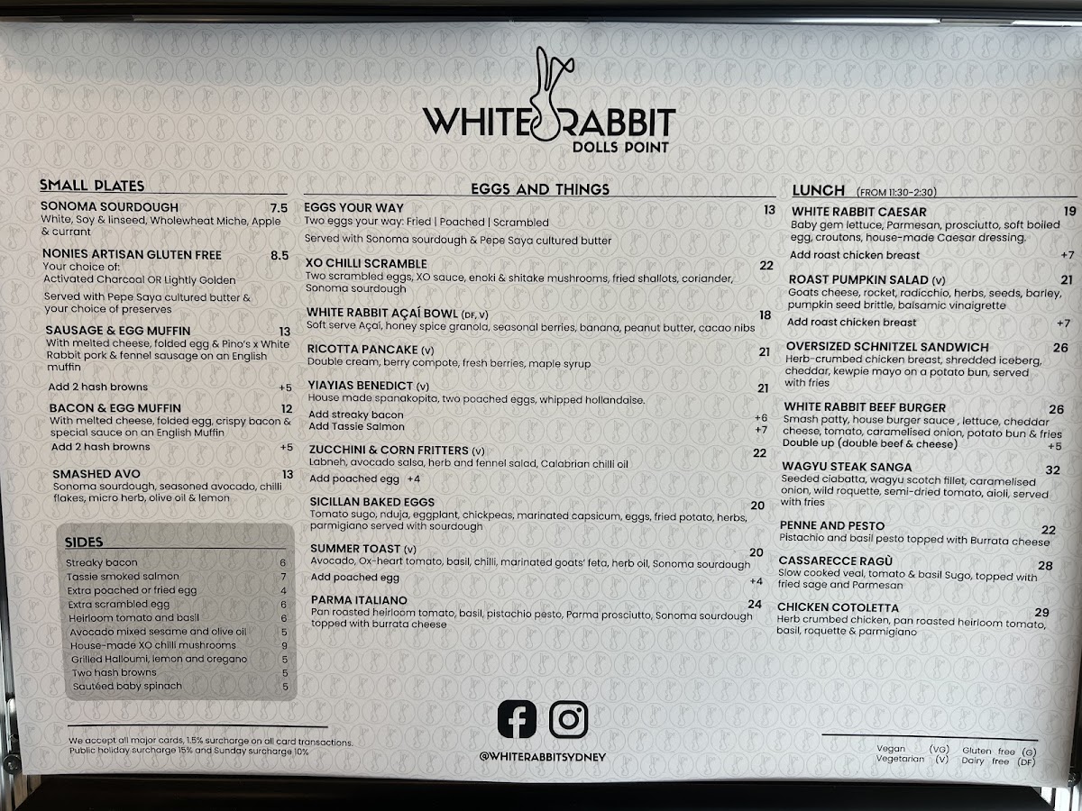 The menu at White Rabbit Dolls Point is thoughtfully organized to cater to different dining occasions, including breakfast, light meals, and coffee breaks. It features a variety of options ranging from takeaway specials to small plates and egg-based dishes.